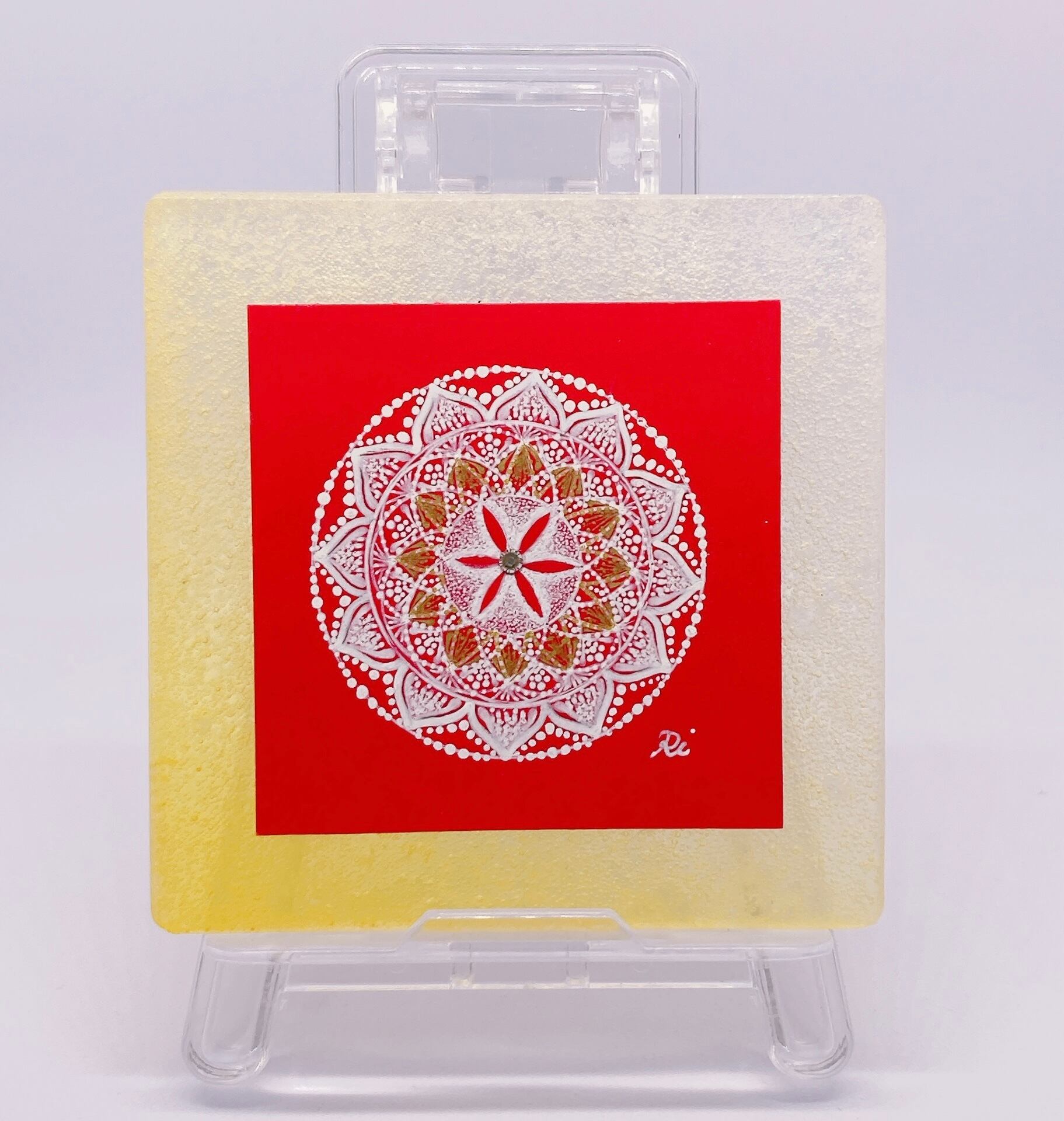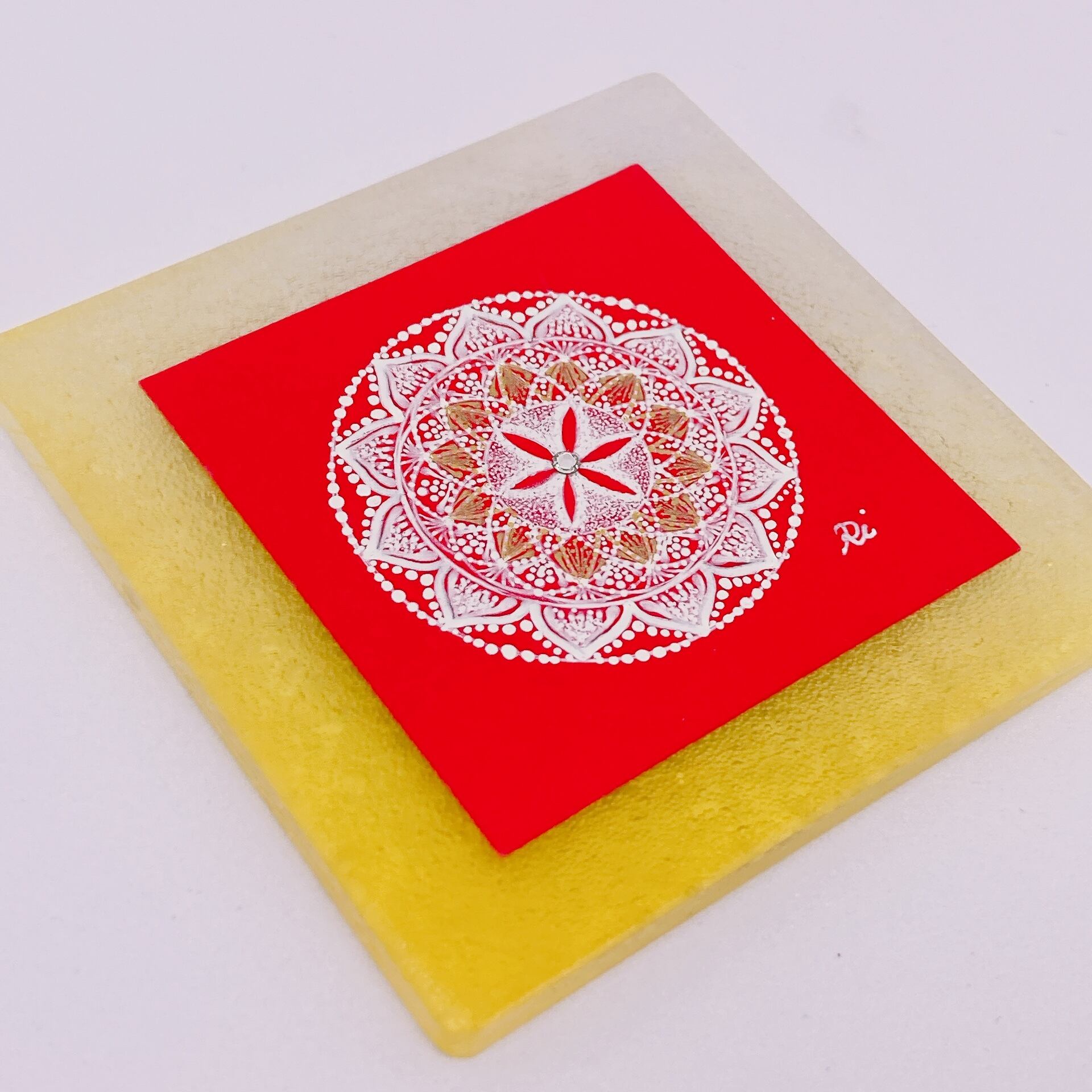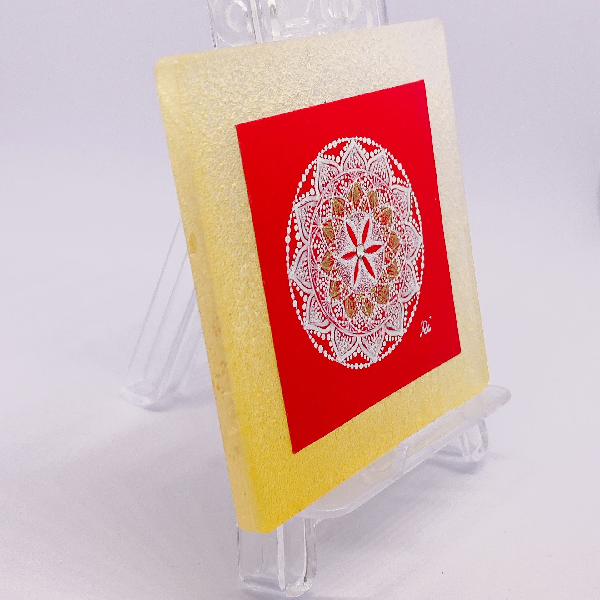 鮮やかな赤をベースに描いた、手のひらサイズの曼荼羅アートです。